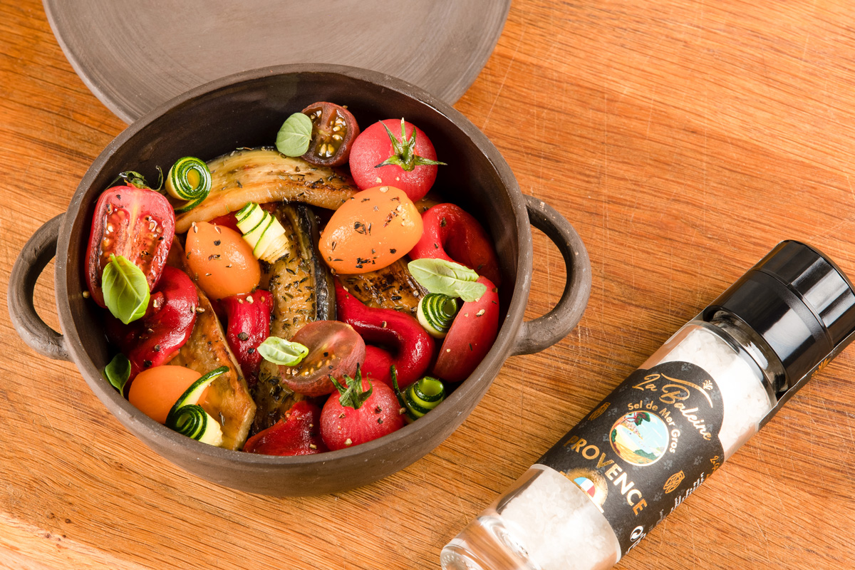 Sortir tous les légumes du réfrigérateur et les déposer dans une petite cocotte ; puis assaisonner de sel moulu de Provence, d’un trait d’huile d’olive et ajouter le basilic. Enfourner la cocotte à découvert à 130°C pendant 20 min.